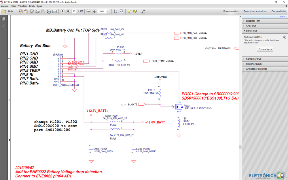 Estou com um Acer A315-58, que não carrega a bateria. O problema é que não tenho outra bateria em bom estado para testar se o problema está nela, então gostaria de saber como posso verificar se o circuito de carga está funcionando corretamente. Com a bateria conectada e o notebook desligado, o consumo na fonte de bancada fica em apenas 0,20 amperes, e o LED vermelho da bateria acende. Medindo o conector da bateria (PJP201), com a bateria conectada, os valores são os seguintes: Pino 1 e 2: GND Pino 3: 3,28V Pino 4: 3,27V Pino 5: 0,15V Pino 6: 0,00V Pino 7 e 8 (positvo): 6,03V Quando o sistema é iniciado, a porcentagem de carga da bateria fica em 0% e o desempenho da CPU fica limitado a 0,19 GHz. Sem a bateria, o desempenho retorna ao normal. O cliente alegou que o notebook é novo, com pouco mais de 1 ano de uso, e que a bateria está boa. Portanto, antes de encomendar uma bateria nova, gostaria de confirmar se o circuito de carga está funcionando corretamente. Obrigado. -