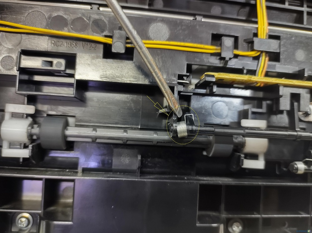 Olá pessoal. Segue dica que pode auxiliar muitos técnicos que as vezes estão se descabelando e não conseguiram a solução para o ERRO E3 na impressora Laserjet M1132 MFP. Já peguei vários defeitos que causam a mensagem E3, que significa " Papel Encravado", papel atolado na bandeja de saída. Chegou uma impressora com esse defeito, e depois de verificar todos os sensores e todo trajeto do papel, nada. O defeito continuava. Imprimia uma página e lá estava o E3. Resumindo... Na parte traseira da impressora tem uma mola que atua fazendo pressão sobre a alavanca do sensor de passagem do papel. Pois muito bem.. essa mola estava aparentemente na posição, porém tinha soltado-se e perdeu uma volta de pressão, o que ocasionava um delay no sensor de passagem causando o erro. Aumentei em uma volta a pressão da mola novamente e pronto!! Seguem as imagens do sensor e atuador...