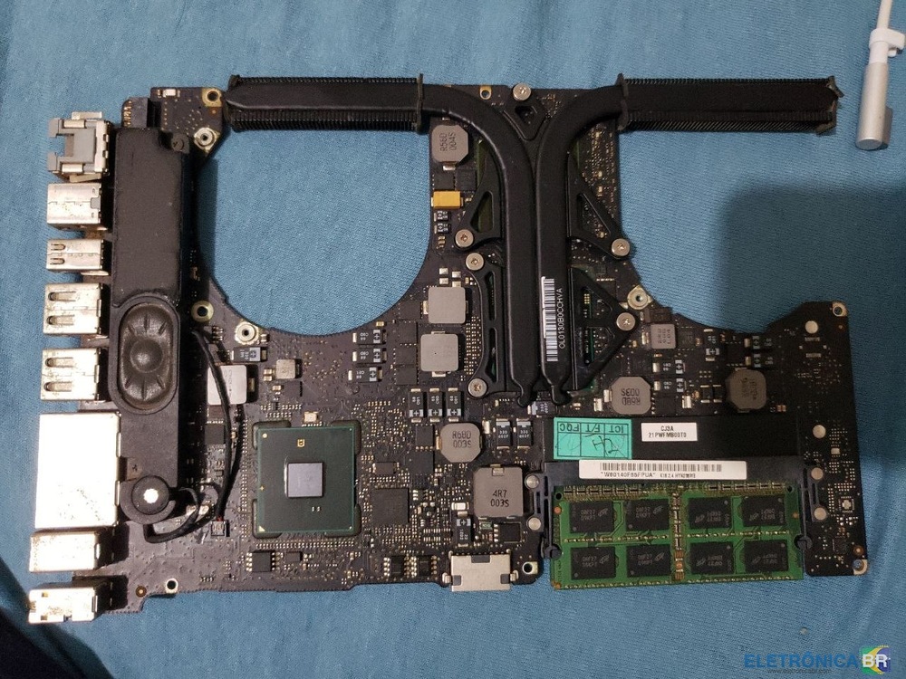 Boa tarde galera, tô com um MacBook pro, modelo a1286, placa mãe 820-2850-A, que trava dentro do sistema, notei que o HD estava com alguns setores ruins, troquei por um SSD. Só que não consigo instalar o sistema operacional porque assim que liga ele trava, testei com outra memória, mas ficou do mesmo jeito. Alguém da uma luz ? O capacitor circulado não é o original, já foi trocado e parece que já foi feito reballing da placa de vídeo, está sem as colas ao redor. -