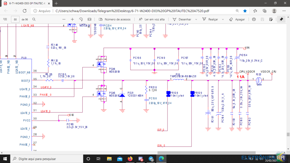Prezados amigos, vou postar junto a esse tópico uma página de um diagrama em blocos de uma placa que estou analisando. Nessa página encontram-se as duas tensões 3v3 e 5v, era para ser assim, mas na realidade encontrei comente a 3v3. Olhando no esquema podemos ver o regulador de tensão uP6182AG, medi o pino "11" chamado de Phase 2 que corresponde aos 3v3, tudo certo, tenho os 3v3. Depois fui para o pino "20" Phase1 e ali já não encontrei os 5v. Testei o pino "16" Vin e encontrei os 19v, então deduzi desde o início que esse regulador de tensão está sendo alimentado com tensão alta de 19v. A minha primeira dúvida é: esse regulador de tensão up6182AG ele recebe os 19v e faz o processo de conversão de acordo com cada necessidade do circuito, ou seja no pino "11" ele tem que liberar os 3v3 para que todas partes do circuito que utilizem os 3v3 possam funcionar e assim ele deveria fazer com o pino "20" mas não está liberando ou convertendo a tensão de entrada 19v para 5v no pino "20". Está certo o meu raciocínio? Para um entendimento mais claro da minha parte, olhando para o esquema anexo o CI uP6182AG recebe tensão de 19v e libera para os pinos que citei assim bem como para outros. Tentando deixar mais claro todo o tipo de CI vai receber uma tensão Vin e vai gerenciar (converter) essa tensão a ponto de distribui-lá corretamente por cada pino de saída a fim de alimentar corretamento todo o circuito da placa, é assim que devo entender? Também vou postar a imagem do uP6182AG que me referi. -