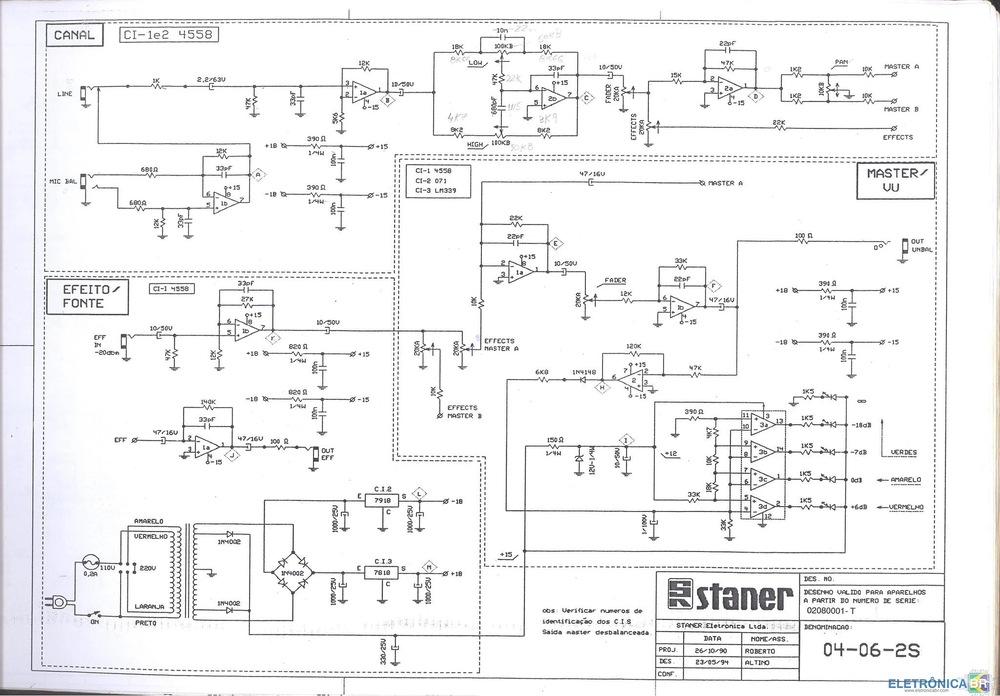 Olá, pessoal! Sou novo por aqui e também novo em eletrônica! Estou fazendo uma reforma em uma mesa de som Staner antiga modelo 04-2S e estou com vontade fazer algumas modificações nela. Com isso acabei me deparando com um grande interesse em eletrônica e vontade de aprender mais. Sendo mais direto, vou postar junto o esquema da mesa, que achei aqui no site, e apresentar as modificaçoes que desejo fazer. - modificar ela para funcionar apenas em 127V - retirar o fusível - retirar o seletor 110/220 Sei dos riscos de fazer essa modificação. Mas como vou usar ela apenas como objeto decorativo e para mandar o audio de minha interface para duas caixas de som, podendo assim ajustar principalmente o grave, não terei problemas com tensão. Já estou fechando os rasgos do chassis onde eles eram encaixados para ficar com uma estética melhor. Desejo então a ajuda de você em quais fios cortar e quais deixar, e também saber se posso remover aquele transformadorzinho que tem dentro dela. Vou postar uma foto interna dela tambem para avaliaçao. Desde já, muitíssimo obrigado! -