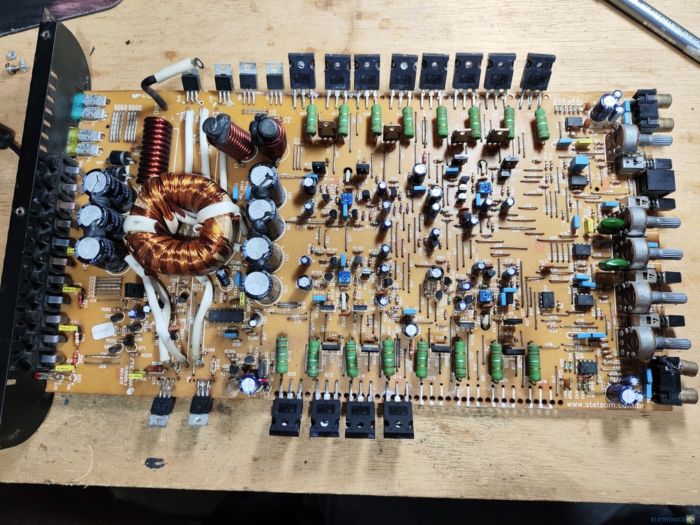 Olá meus amigos, mais uma vez pedindo a ajuda de vocês. Estou com esse módulo que não acho esquema elétrico em lugar nenhum, se algum amigo puder disponibilizar um esquema, ou até mesmo de um outro que também tenha saídas tip25c e 36c para comparação eu agradeço. De defeitos tem uma das saídas que esquenta até queimar o transistor, mesmo sem sinal de áudio. Retirei os transistores de saida e testei as outras 3.. elas não esquentam, porém uma delas tem ruído forte no áudio, outra está com áudio baixo, enfim. Muito trabalho pela frente. Foram trocados os transistores de fonte por outra pessoa, não sei se são os mesmos de fabrica de um lado esta um par de irf1404 e do outro lado um par de irfz48n. Transistores de saída, aparentemente originais. Gostaria de deixar ele com os componentes igual de fabrica. -