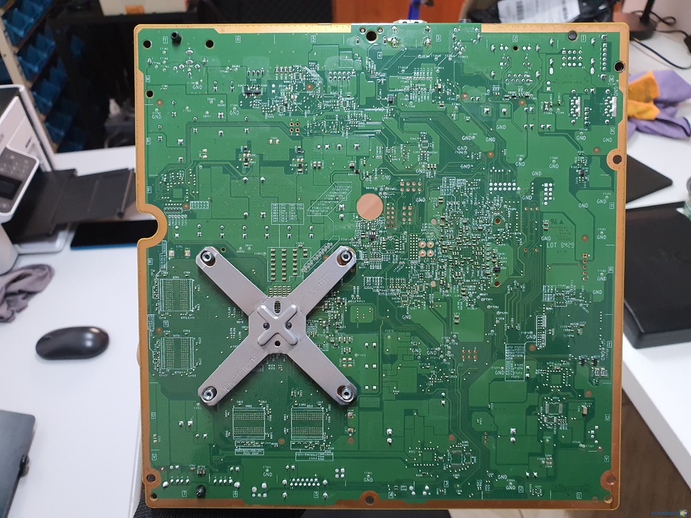 Olá! Estou com um Xbox 360E (Aquele modelo Slim que a frente é toda reta), sem sinal de vida, nenhum comportamento de inicialização. Fiz algumas pesquisas e medições rápidas pra ganhar tempo e descobri que esse é um defeito comum em um microcontrolador perto da alimentação (U5A1) cujo sua função é reduzir os 5V do standby para 3V, nas pesquisas e nos relatos esse microcontrolador quando da defeito a voltagem fica abaixo dos 3V ou (enlouquece), deixando a voltagem totalmente descontrolada, foi os casos que ví, mas no meu caso os 5V que entra do lado direito do microcontrolador que deveria sair 3V do lado esquerdo onde marquei com um ponto vermelho está saindo a mesma tensão de 5V, queria confirmar se esse modelo é diferente, verificando no esquema eletrônico da placa se realmente esse CIzinho fechou ou alterou sua funcionalidade de alguma forma dependo da versão dessa placa desse modelo. A fonte aparentemente está normal (indicador laranja) mandando 5V do Standby aguardando start do console que não liga. Deixo esse tópico para obter sugestões e talvez ajudar alguém que passe pela mesma situação também, agradeço desde já a todos!