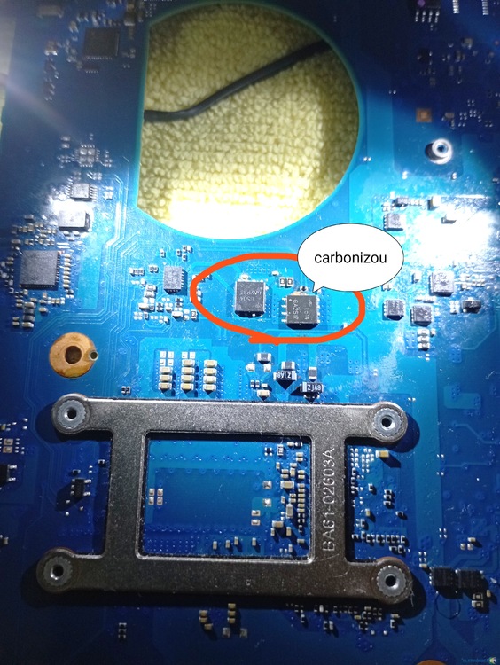 Peguei esse notebook para estudo em eletrônica, de começo ele estava com um Mosfet 6514 carbonizado próximo ao processador, com isso eu troquei os dois mosfets para ter certeza e após a troca acendeu o Led porém eu apertei o power ele entrou em curto novamente. Aí fui fazer testes na fonte de bancada conectando direto no Jack e com uma tensão de 17v já começa a piscar o C.C do da fonte, porém não tenho osciloscópio para ver o que está acontecendo com isso eu coloquei álcool isopropílico em cima dos mosfetes de entrada e um deles fica pulsando e esquentando e em seguida o outro. Fiz medições no Mosfet e obtive: D do Mosfet é 16,93v então medi o ci charge bq735 e apresentou esses valores vcc = 16,40v, acdet = 2,52v, regn = 5,99v, acdrv = 0,55v, cmsrc = 0v, acok = 0v somente esses. O gate 0,10v do, e 0v no src do mosfet. 3 capacitores de filtro fecham continuidade assim na foto. Não sei o que é eu não achei esquema dessa placa mas tenho uma placa e um esquema parecido aqui de outro notebook Samsung. Quem puder me dar uma ajuda.Não sei se os mosfets que troquei queimaram de novo.(Foram realizadas as trocas de todos os mosfets em vermelho)- 1 resposta