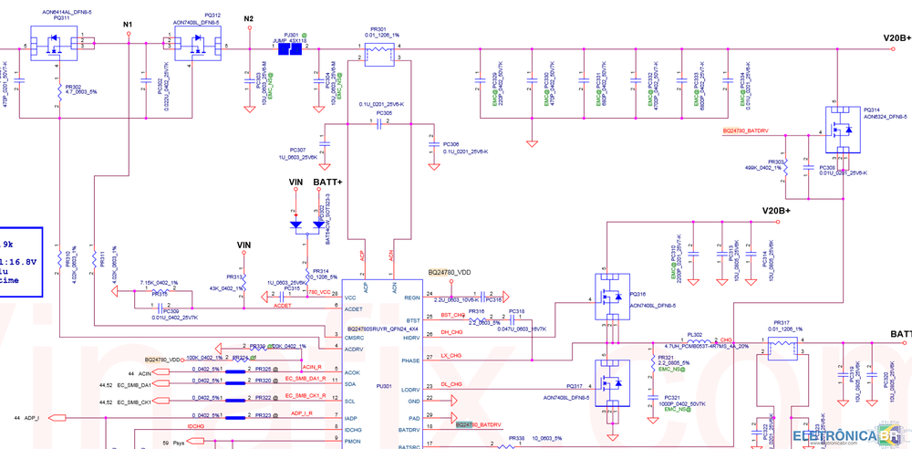 o Notebook liga no adaptador AC sem a bateria Se colocar a bateria carregada e startar ele funciona normal Se acabar a bateria e plugar o AC ele não liga Se ligar pela bateria e depois plugar a fonte: ele não carrega a bateria mas fica ligado Se ligar pela bateria, plugar a fonte e depois desligar a bateria: desliga o notebook Me parece que a comutação da bateria para o adaptador AC não está funcionando: Medições no BQ24780 com a bateria e a fonte plugados ACDET: 2,8V VCC: 19,5V ACN: 7,5V (tensão da bateria) ACP: 7,5V (tensão da bateria) REGN: 5,9V Problema na bateria, SIO ou BQ24780? "Se acabar a bateria e plugar o AC ele não liga" Parece que o BQ247 não consegue habilitar a alimentação pelo adaptador AC com a bateria conectada -