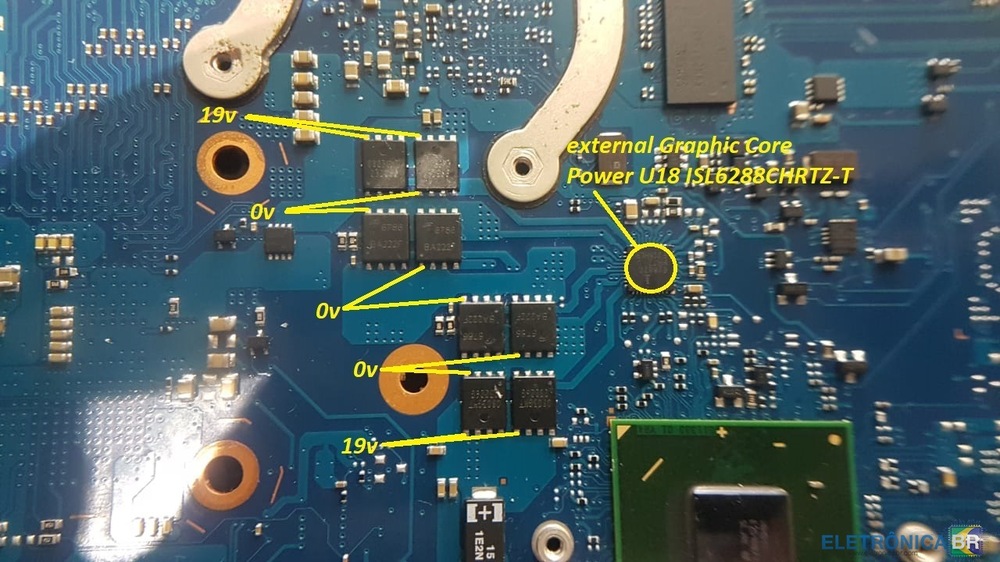 Fala ae galera, estou com esse equipamento me dando dor de cabeça, aparelho liga porém não apresenta video no LCD e nem mesmo externo! Fiz testes em todas as bobinas e verifiquei que as bobinas da fases de alimentação da cpu e gpu não estão apresentando tensões, encontrei também um capacitor em curto proximo ao CI do CPU VRMN (U11 no esquema), fiz a troca do mesmo mas as VRM"s ainda n apresentaram tensões! Vou mandar junto algumas fotos com descrição e uma imagem da boardview que me ajudou a identificar alguns componentes, lembrando que a placa não possui serigrafia e eu não encontrei a boardview em lugar algum. Testes realizados: 1-Regravação da BIOS 2-troca de capacitor em curto 3-ME no chipset e GPU- 11 respostas