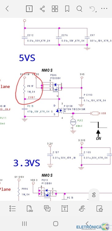 Defeito apresentado, ligava e logo após desligava, ou algumas vezes ficava até um tempo ligado, ora o cooler funcionava outra não, quando desligava tinha que esperar um tempo para poder ligar novamente, ora ele ligava mas não aprecia imagem nenhuma, e a tensão de alimentação do processador ficava em 0 volts, depois de muito tempo de procura do defeito, percebi que a tensão secundaria dos 5 volts (são duas) uma fornecida pelo Pq46 (p1203bv) e outra pelo Pq47 (p1203bv), elas ora vinha com 5v, ora com 2,8v, na tentativa de medir as tensões nos pinos dos fets quando tocava com a ponta de prova no pino 4 (gate) a placa desligava totalmente, fui a procura dos componentes defeituoso, ja tinha feito os teste nos fets e estavam bons, nos testes dos componentes periféricos aos fets, encontrei 2 resistores abertos, ambos de 1m, pr97 e pr98, trocados, as fontes de 5v ficaram ambas com 5 volts estabilizadas assim fazendo com que o notebook funcionasse sem problemas, não desligando mais. fica a dica... -