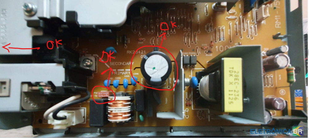 Bom dia, Estou com essa impressora em bancada, segundo o cliente ela pegou água. Desmontei ela ontem e não encontrei nenhum resquício de água, para segurança deixei parada e só tentei ligar ela hoje. Ela não dá nenhum sinal. Desmontei a impressora e tirei a plca fonte fora. Testei os dois fusíveis estão bons, capacitor ok. Placa lógica testei em outra impressora e está ok. -