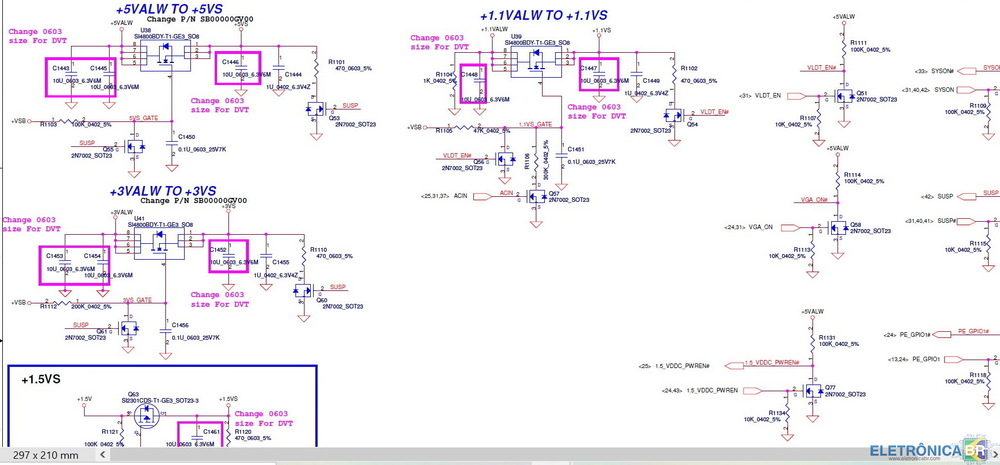 Boa tarde, amigos. Essa placa da descrição ao tentar liga-la pelo botão power, nada acontece. Quando a ligo fechando curto direto, liga rapidamente (porém, LED nenhum acende nesse momento). O consumo na assimétrica vai entre 200 e 500mA em questão de milissegundos e desliga. As fontes primárias de 3,3 e 5v estão ok. Testei os sinais principais do super I/0 e não encontrei defeito, regravei o BIOS por desencargo de consciência, mas não resolveu. A placa não possui curto. Suspeitei de alguma tensão transferida, mas não encontrei no esquema elétrico, esses circuitos que pudessem ser analisados. Até encontrei uma parte que eu poderia supor que fosse sobre essas tensões, só que no esquema elétrico, não há indicação VIN ou B+ entrando nos gates desses mosfest transferidores, que eu pudesse concluir que seriam eles a serem testados (vou mandar foto em anexo dessa parte do esquema). Se alguém puder dar uma luz sobre isso, se já pegaram problema semelhante e resolveram, agradeço muito! -