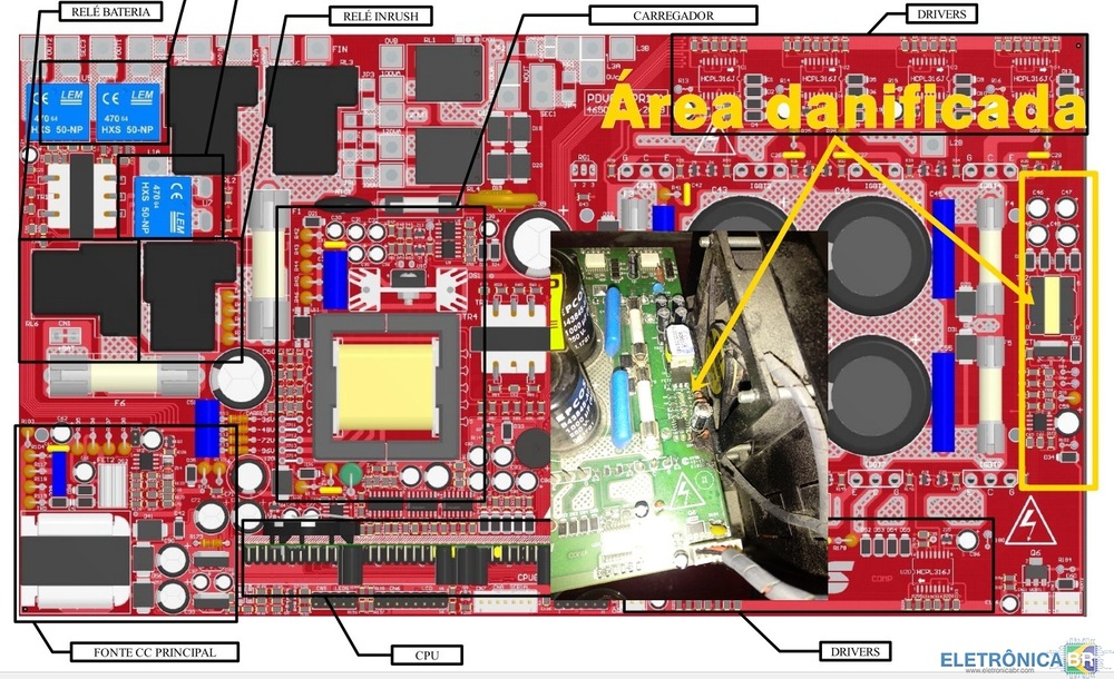 Olá a todos... recebi este no-break com forte cheiro de queimado. Ao abrir verifiquei que uma parte do circuito tinha, literalmente, carbonizado (torrado) conforme mostra a imagem ... O modelo da placa segue na imagem seguinte e, pelo que vi, é comum a outros modelos... Agradeço pela ajuda... -