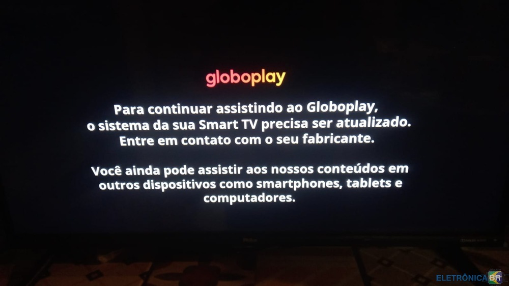 Olá, sou iniciante na área de reparos, e um cliente chegou com esse equipamento. O mesmo está funcionando normalmente, exceto alguns apps em especifico, nesse caso o GloboPlay. A TV apresenta mensagem de que é necessário entrar em contato com o fabricante para obter uma atualização. As únicas que encontrei são do final do ano passado e não me inspiraram confiança. Estou aguardando o cliente estar disponível novamente para poder fazer uma visita e testar o firmware que encontrei. segue a imagem do erro. -