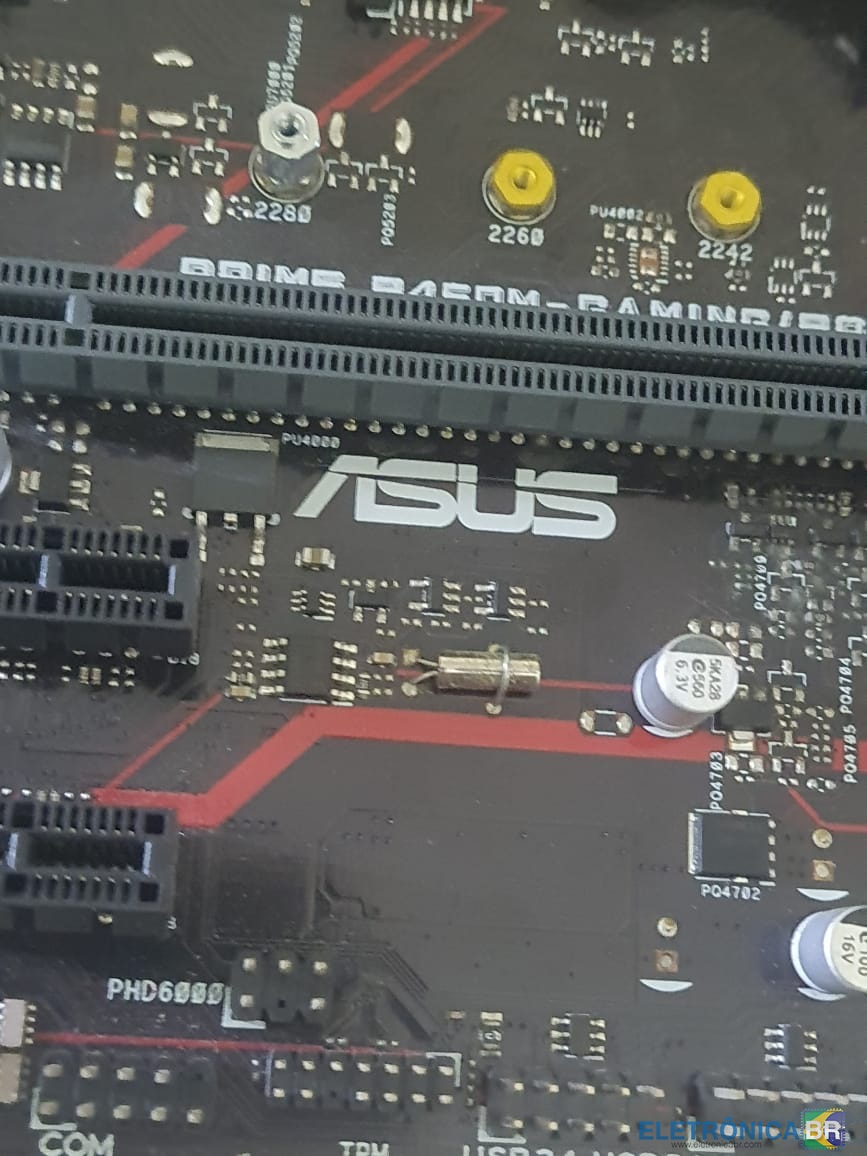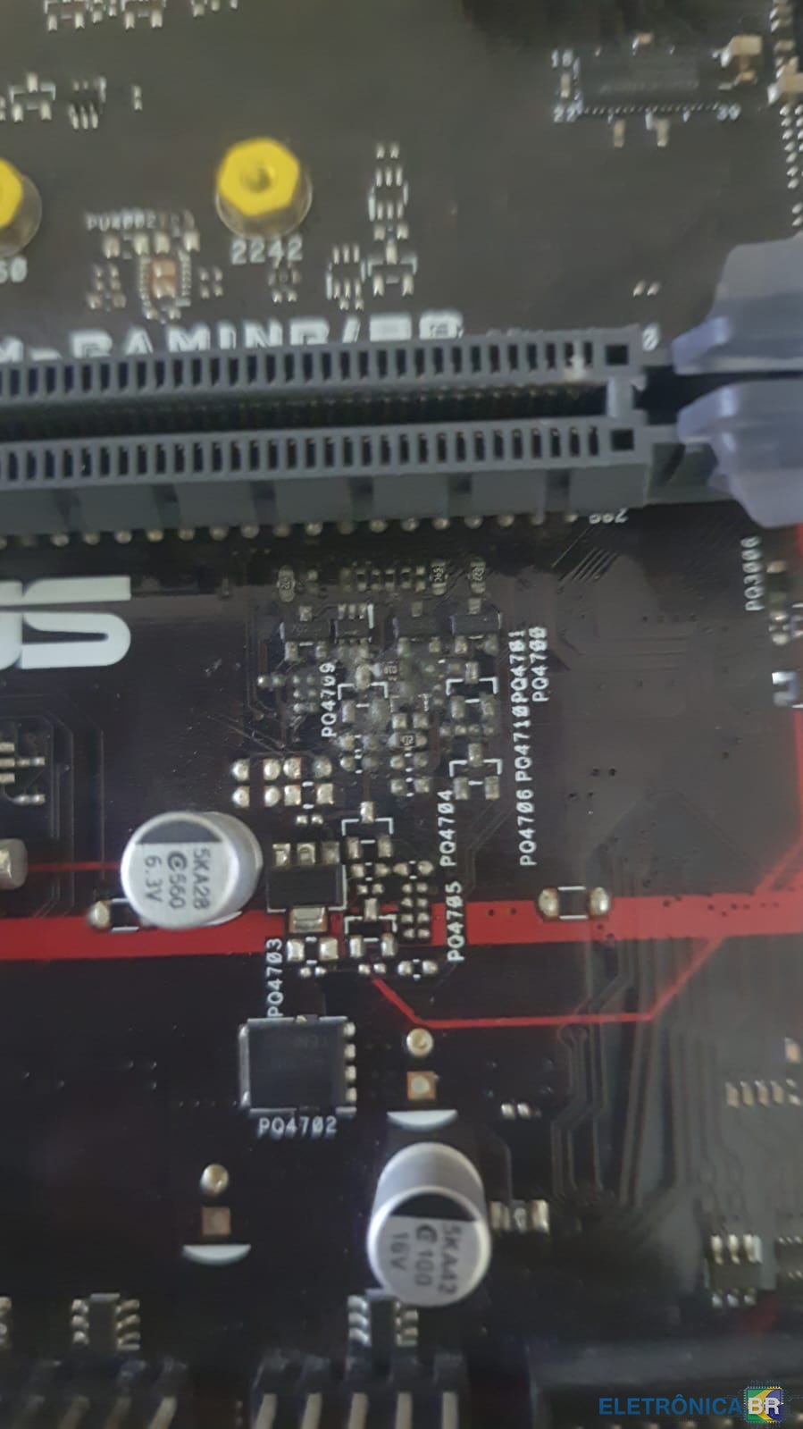Tô com uma Asus B450M-Gaming/BR que no começo não liga, até aí, esquento via soprador térmico, focando nos cristais osciladores ao lado do FCH e abaixo do PCIe x16 (há mais dois, sendo um ao lado do CI de rede, mas não vejo sentido em esquentar essa parte, e outro está no lado da CPU, porém, não precisei esquentar esse), após isso, a placa mãe parece "ligar", digo entre aspas, pois não parece que após o aquecimento, ela de fato liga, pois ao desligar, e esfriar, ela liga normalmente, ou simplesmente se não ligar, posso deixar a fonte demandando tensão que após um tempo, ela simplesmente liga, o que parece normal, mas o problema é que não dá para saber ao certo o real defeito. Já efetuei o aquecimento em apenas um dos cristais osciladores ou na FCH e mesma coisa, ela parece ligar apenas por questão da tensão. A minha dúvida, é ser de fato pode ser o cristal oscilador o problema, e qual seria o mais possível, vendo no boardview dela, tem o de 25.000MHz que interliga o FCH, dois de 32.768kHz que seria um que interliga a CPU diretamente, e outro que passa por um CI que aparenta também ser responsável com a CPU, sendo "6S_SMBCLK_VSB_R" e "5S_SMBDATA_VSB_R". Tenho outras placas mãe aqui que posso fazer a retirada do cristal oscilador de 25MHz ou 32kHz, mas antes gostaria de ter uma certa confirmação para não sair trocando qualquer coisa. Fiz a verificação da tensão, pois da frequência não confio em fazer pelo multímetro e não tenho osciloscópio, e o da FCH (não medi os outros por não saber a tensão de trabalho), tá dando 0.55mV, mas ao que me aparenta, tá certo, pois a tensão de trabalho é 1.05V. Além disso, já efetuei uma limpeza via limpa contato, retirando qualquer obstrução que poderia ter nos terminais ou solda. Mas tem uma área que não sai por nada isso e me parece ter se agravado em algum tipo de camada de umidade, mas verifiquei no boardview e só tem componentes SMD do USB, apenas um que seria do PSON, mas tá dando 3.33V em ambos. Cristal oscilador de 32kHz que interliga a CPU por um CI (esse do lado). Cristal oscilador de 32kHz que interliga a CPU diretamente. Cristal oscilador de 25MHz do FCH que interliga a FCH. Placa mãe inteira, usando um Athlon 3000G, memória RAM de marca mais desconhecida, mas que funciona e uma fonte KCAS de 550W (ruim, mas funciona). Obstrução nesses resistores, transistores e capacitores, porém, apenas o segundo transistor da esquerda para direita que é responsável pelo PSON, mas não parece estar com defeito.