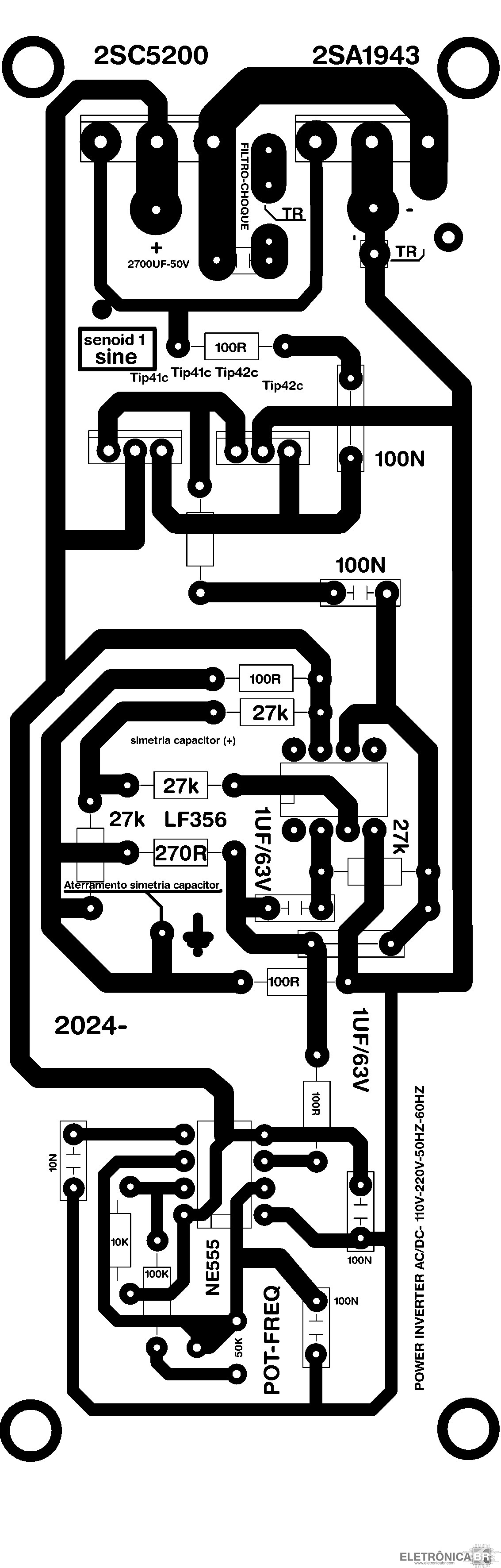 Inversor ne555 LF356 PAR COMPLEMENTAR. Circuito do LF imita uma simetria pela adição dos resistores de 100R 2whatts indo á terra . Só passando uma ideia de como pode ser o projeto. Usa fonte comum mas o LF356 Trabalha simétrico por conta da adição de resistores de 100 se comportando como fonte simétrica mesmo usando fonte simples ou bateria imitando uma simetria usar capacitores estilo simetria no lf356 . Mas pode continuar alimentando com fonte simples bateria simples . Modificação achado no N.C B. NEWTON C BRAGA. https://www.electronica-pt.com/forum/montagens-projectos/101690-inversor-100-senoidal-ne555-lf356-complementarprojeto-download Download do projeto: Droid-pcb 2.0.7 Ajustar a imagem em programa fotoshop adequado. Montagem artesanal. Se de feito artesanal por partes. no -