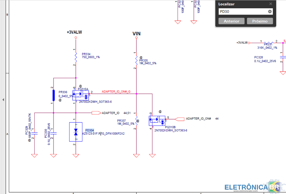 Bom dia! Este notebook esta com o componente PD304 carbonizado, a referencia da peça é de um supressor modelo AZ5123-01F e eu não tenho outro igual para trocar, a função dele é ser ligado ao pino agulha do carregador que recebe um sinal, ADAPTER_ID parte do Super I.O que também torrou IT8586E, já comprei e irei substituir, porem o que me falta é saber se posso ou não por apenas um resistor ou ou diodo comum no lugar deste supressor PD304, alguém sabe me tirar esta duvida ? -
