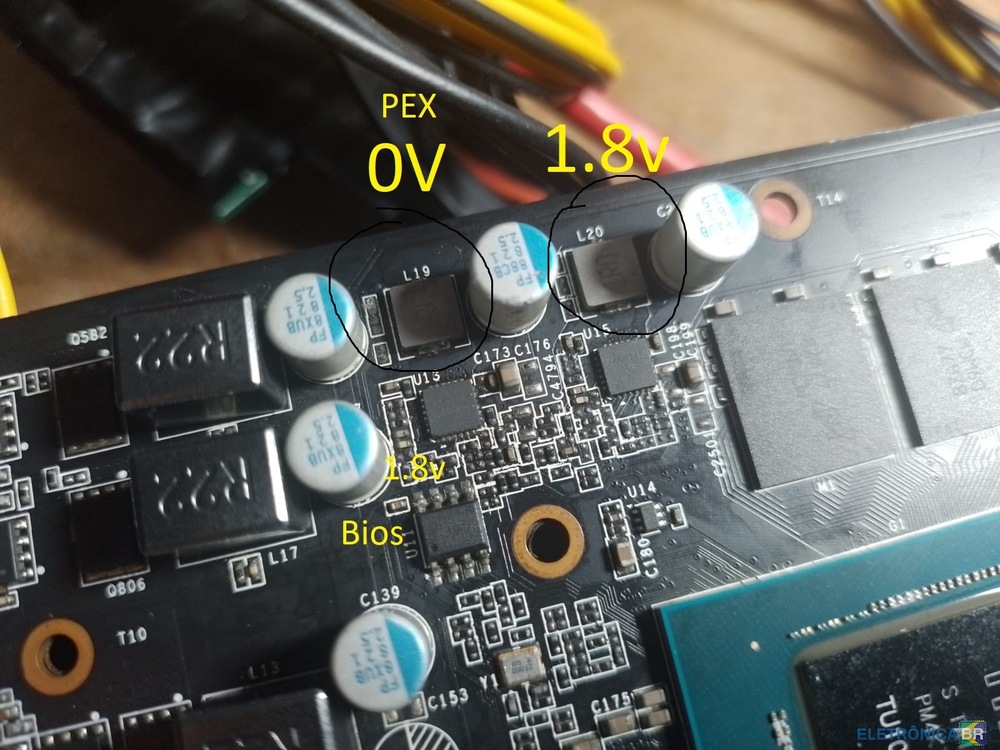 Olá colegas! Estou com uma placa de vídeo Geforce RTX 2060 Galax versão one click que não sobe imagem. Verifiquei que a mesma possui as tensões primárias de 12v e 5v, bem como 1.8v na bobina e na bios! Mas não tem Vcore, Vmem e PEX! Ao ligar a placa a fan 1 fica girando e a 2 nunca funciona! Estas são as resistências: Bobina 1.8 = 328 oms. Bobina PEX = 11 oms. Bobina Vcore = 1 oms (que seria normal). Bobina Vmem = 23 oms (achei baixa). Alguém poderia me dar uma luz?