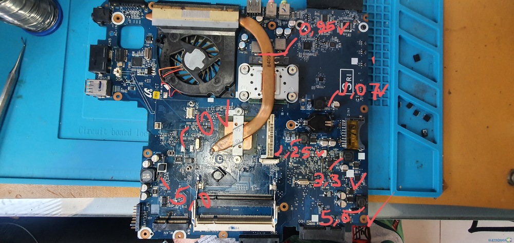 Olá amigos do EletronicaBR. Estou com um notebook relativamente antigo, mas cliente fazia uso por ficado bom depois do upgrade. 1)Vamos lá: A placa não estava gerando as tensões previstas devido a curto de um componente CI U8 Gerador de Clock fiz a reposição utilizando esquema elétrico. 2) Depois disso a placa passou a indicar led de stand-by e não acionava o power. Então resolvi regravar a BIOS. 3) Após regravação a placa liga, gira o cooler porém sem vídeo. Resumindo: BIOS regravada com gravador e rom original. Placa liga mas a tensão de 1,8V responsável pela alimentação da memória DDR2 apresenta apenas 0.92V (L504). Troquei PWM U7 SC486 e está OK. Fiz reballing no bga ATI. Minha dúvida é como posso identificar a falta de tensão 1.8V_AUX? Já revirei o esquema na parte de switchON_ddr2 e tudo está correto. -