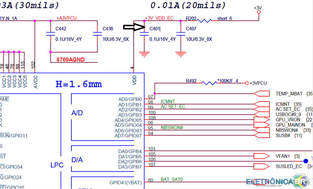 Estou com esse equipamento na bancada, apresentava um leve aquecimento no Super I/O, troquei o I/O ele voltou a dar imagem, ficou um tempo ligado, desliguei pra montar e ele parou de dar imagem de novo. Obs: Não sei interpretar esquema, estou aprendendo, mas pelo que entendo o componente C401 deveria ter 3v mas ele esta dando continuidade com aterramento nos dois lados no componente. Tirei esse componente e da a mesma continuidade com o aterramento nos pad's da placa, mas quando removi esse componente ele voltou a ligar, fiz o teste de desligar e ligar de novo e parou de novo. Voltei o componente e ele ligou, fiz o mesmo teste de desligar e ligar de novo e não deu imagem de novo. Ou seja esta intercalando esse problema. O que fiz: Atualizei a Bios e troquei o I/O Outra observação, esse pc estava em outra assistência e o cliente disse que foi feito aquecimento da placa mãe com soprador térmico pq estava com esse mesmo problema de hora liga, hora não liga.