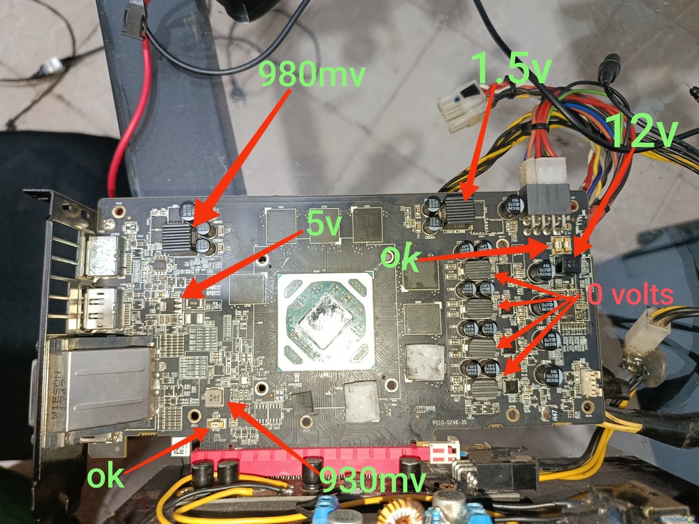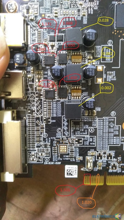 Bom dia,estou a dias tentando arrumar essa placa e até agora nada,placa de uso pessoal,comprei ela nova para mineração em 2017,fiz bios mod e ela ficou funcionando por 2 semanas e parou,as outras que eu tinha nenhuma deu problema,guardei ela e agora fui tentar reparar,ela estava sem tensões,totalmente morta,estava faltando tensão de enable no gs7103 (ele libera tensão de 1.8v quando funcionando),fiz um jumper para alimentar o enable e a placa liberou as tensões,agora ela até esquenta (da pra aguentar com o dedo encima) mas nao gera imagem,ja regravei bios e ainda nada,nao sei mais o que fazer,se alguem puder me ajudar agradeço.