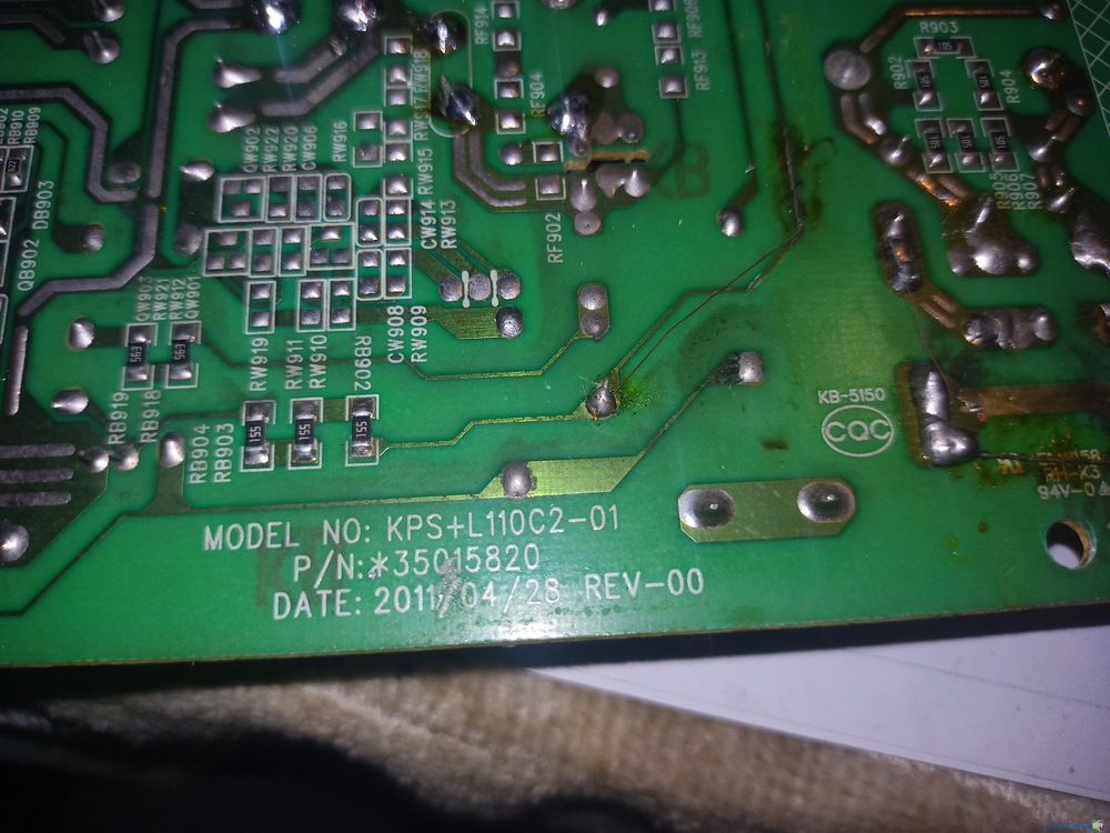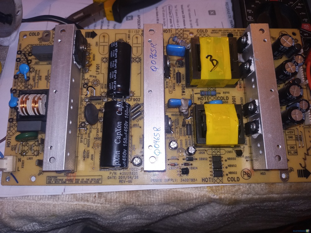 codigos da fonte : KFS+L110C2-01 p/n : *35015820 power supply : 34007854 estou trabalhando somente com a fonte na bancada , a tensão na saida da fonte que era para dar 12v está dando 7v e a tensão do ps_on está em menos de 0.5v Já tentei trocar o Q0465R sem sucesso . Quando peguei essa tv para examinar vi que já esteve em outra oficina , no lugar do fusivel soldaram um fio e tinha uma trilha na entrada estourado que recuperaram a trilha . -