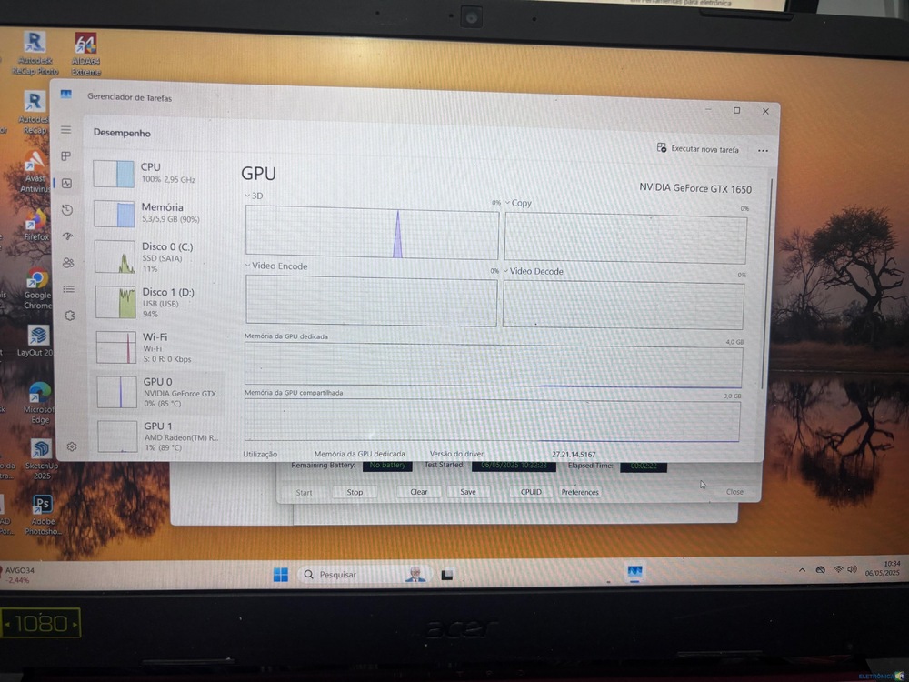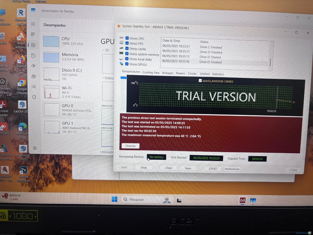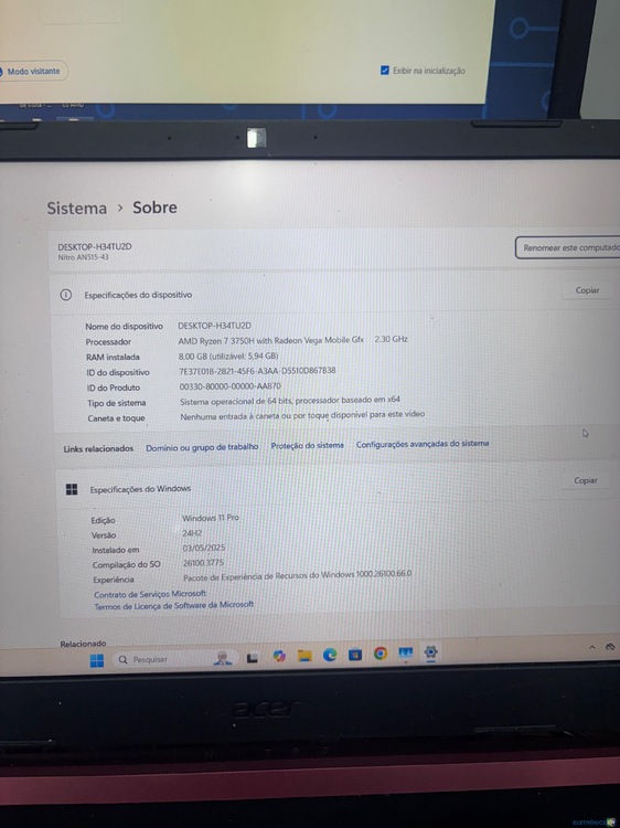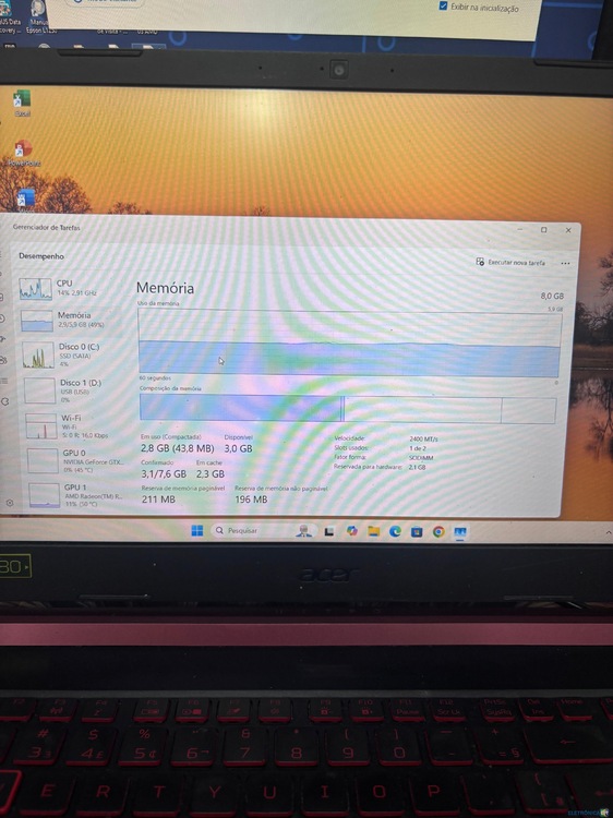 Olá meus amigos da informatica. Estou com um notebook Acer Nitro AN515-43 que está me tirando o sucessego. Inicialmente ele tava desligando sempre que forçava, achei que poderia ser superaquecimento. Porém de tanto insistir em manter o notebook ligado o sistema corrompeu, tive que instalar novo sistema pra funcionar. Logo percebi esse problema na memoria ram, ele ta com 16GB de ram ddr4, mas no sistema só apresenta 5,9GB, sendo 10,1GB reservado para hardware, conforme segue nas imagens que estarei enviando. Já tentei instalar outro sistema e fica da mesma forma. troquei as memória ram e tambem não muda. Mesmo colocando só um pente de 8gb ela reserva mais de 2gb pro hardware. Tentei tambem colocar a memoria no maximo pelo msconfig, e mudar a opção na bios para disable do IOMMUU, mas nada adiantou. Outro detalhe desse notebook, é que quando está as duas memoria conectada, se balancar o notebook ou sofrer um leve impacto, ele trava. Percebi tbm que a placa grafica do processador esquenta muito quando extressa, mandei a imagem da temperatura, chegando a mais de 90°C, não sei se é normal, gostaria que me informassem sobre isso tbm. Resumindo, o notebook não utiliza as memoria ram em sua totalidade, trava com qualquer impacto que sofre, e ao superaquecer as vezes ele trava tambem sendo obrigado a forçar a reinicialização. Me ajudem por favor pois já tentei tudo que imaginei o que poderia ser esse problema e não detectei.