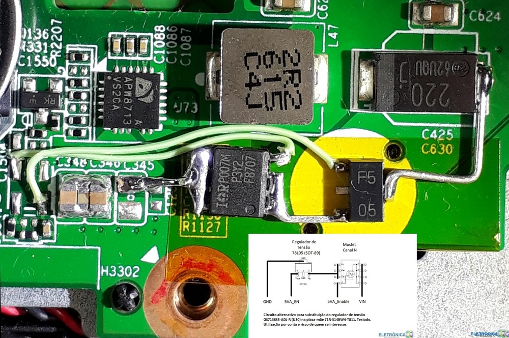 Olá amigos boa tarde, esse modelo todos sabemos que queima o ci u30 que regula 19v para 5v e habilita outro ci u74 de 1,05v, normalmente os 02 queimam, porem só achamos no mercado o CI qfn de 1,05v o u74, o que regula 19v para 5v não achamos, ai temo que fazer uma adaptação com o um 7805, que recebe 19v e manda 5v. segue a foto da adaptação. -