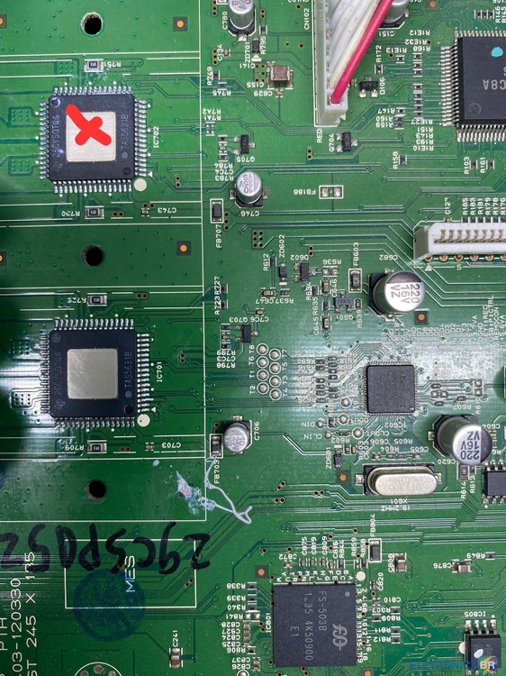 Esse aparelho chegou morto, bastante oxidado, efetuei uma lavagem da placa completa, consertei a fonte, e apos isso comecei com a analise. Estava com o irs1408 ruim, apos toda resoldagem dos componentes oxidados no setor ao redor do ci, e a troca do irs2092 alem de R1529, R1544. Voltou a funcionar. Porem o ic1406 nao oscila nem a pau. Ja troquei o irs por 3x, inclusive o ic1403. Sa falta fazer da mesma forma que fíz com o outro canal, que e remover e ir testando´e repondo cadã um se tiver ok. O problema e que ao medir o pino 3 com o scope, tenho tensao dc de 1,2 entre 1v. E assim o ci não oscila. Ja troquei os irf da linha por inumeras vezes e nada. @ohmda um alo aqui mano