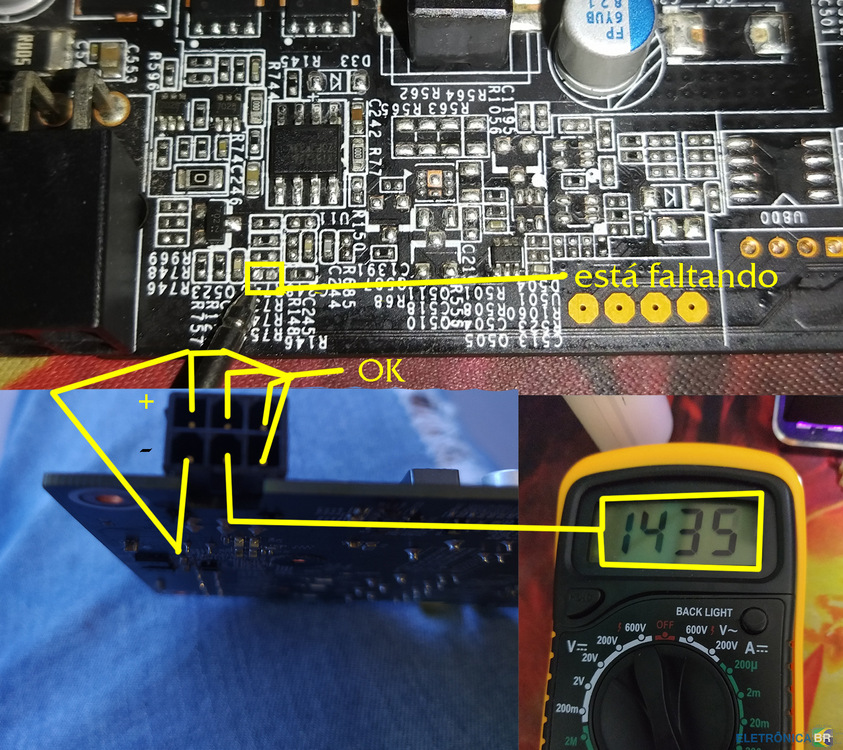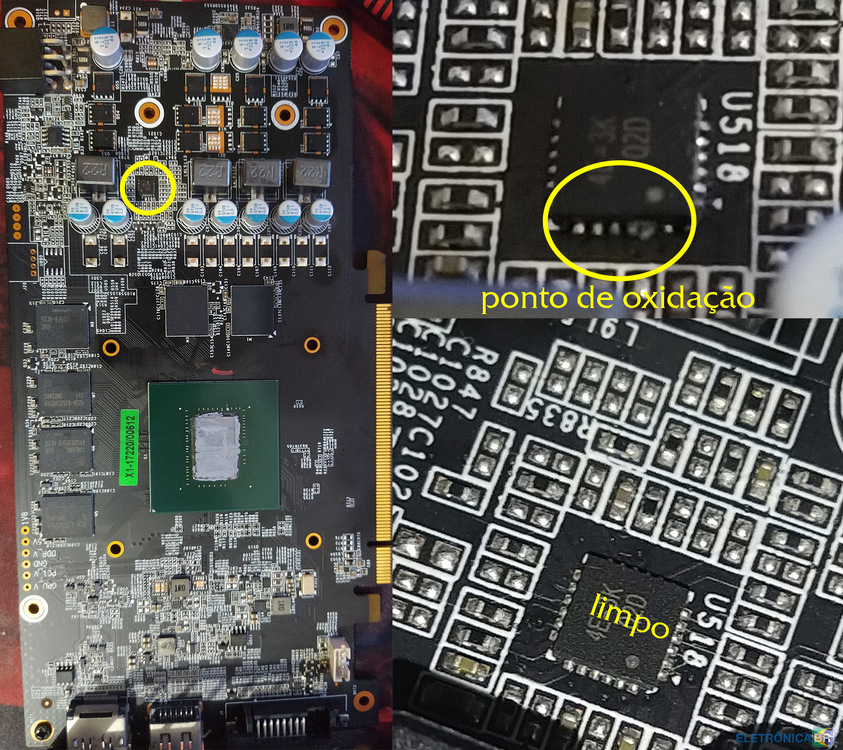 Ola galera venho aqui em busca de ajuda, minha placa de vídeo não está dando vídeo funciona o sistema de ventilação porém não esta dando vídeo, no momento de testar os terminais para ver se tinha algum com curto encontrei uma coisa incomum, o PCI esta normal porém alimentação da fonte um terra não esta dando contato igual os outros segue a foto. e o por ultimo vi que esta faltando um resistor.(DETALHE NA IMAGEM 1) Logo depois de muito olhar vi que tinha um ponto de oxidação em um PWM, fiz a limpeza com álcool isopropílico e mesmo assim o terra continua apresentando resistência, alguém tem ideia do que seja?- 2 replies