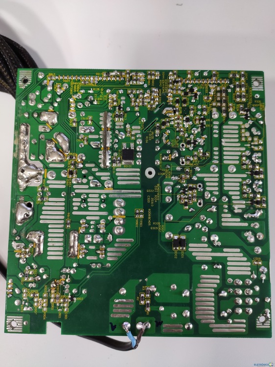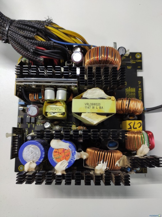 Essa fonte atx corsair está com o seguinte defeito, ao plugar na energia, ela gera os 5v standby no fio roxo, ao conectar o ps-on (fio verde) ao terra, a fonte tenta ligar e ja desliga na mesma hora, o fan chega a se mexer. Feito medição no capacitor principal PFC, ao ligar ps-on no terra a tensão pfc aparece (380v) e a fonte logo desarma, no secundário aparece os 12v e já some, (devido a fonte entrar em proteção e desarmar). As tensões 3.3 e 5v são geradas por conversores dc-dc que são derivadas da tensão principal de 12v, estas nem chegam a aparecer na medição no momento que a fonte tenta armar. Verificado possível curto nas saídas, soldas frias, capacitores e etc.