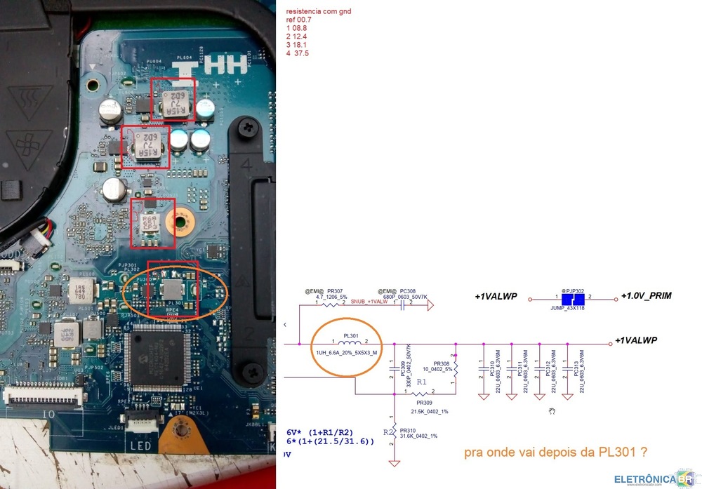 Estou com esse notebook na bancada que não da imagem. Consigo encontrar as pincipais tensoes de 5v,3v,1,0 com exceção da bobina pl7 Ja testei o processador, memoria e regravei a bios. não possuo o esquema ainda se alguem puder da uma luz desde ja muito obrigado a todos -