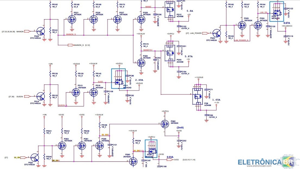 Ola, boa noite. estou com um notebook itautec com seguinte defeito. Mesmo ele estando desligado, o HD continua girando e o driver de cd dvd fica ligado. verifiquei o problema, e vi que ele continuava alimentando os satas, mesmo desligado. o problema acontece independente da forma como eu desligo, é só ter alguma fonte de energia (carregador ou bateria) e o hd e driver já ativa. eu consegui resolver o problema, trocando o PQ21, Mas ele logo volta a dar problema, tendo que troca-lo novamente.. na segunda tentativa, troquei os restantes da linha dele (PQ21, 26 e 28) e logo voltou apresentar o maldito problema.. medi os resistores PR166 e PR169 e estão oks.. se alguém podê dar uma luz ai... sem esperanças já rsrs obs: esse not dava vídeo uma hora sim e outra não, mas foi resolvido após o processo de tântalo. -