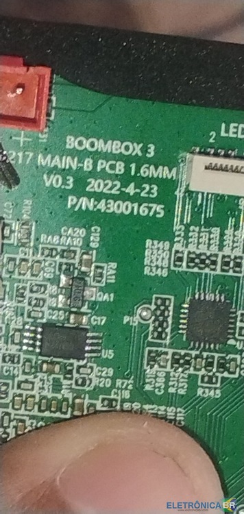 Bom dia aos queridos colegas de profissão, meu nome é Clauton Veiga e estou precisando de uma ajuda dos colegas. Entrou uma caixa de som da JBL, Bombox 3 wi-fi V.03, ela está com o seguinte defeito. Só funciona ligada na tomada. Eu abri e embaixo do dissipador da saída de som, tinha esse componente carbonizado. Provavelmente um mosfet. Posição na placa, Q18 Algum dos colegas saberia essa referência? -