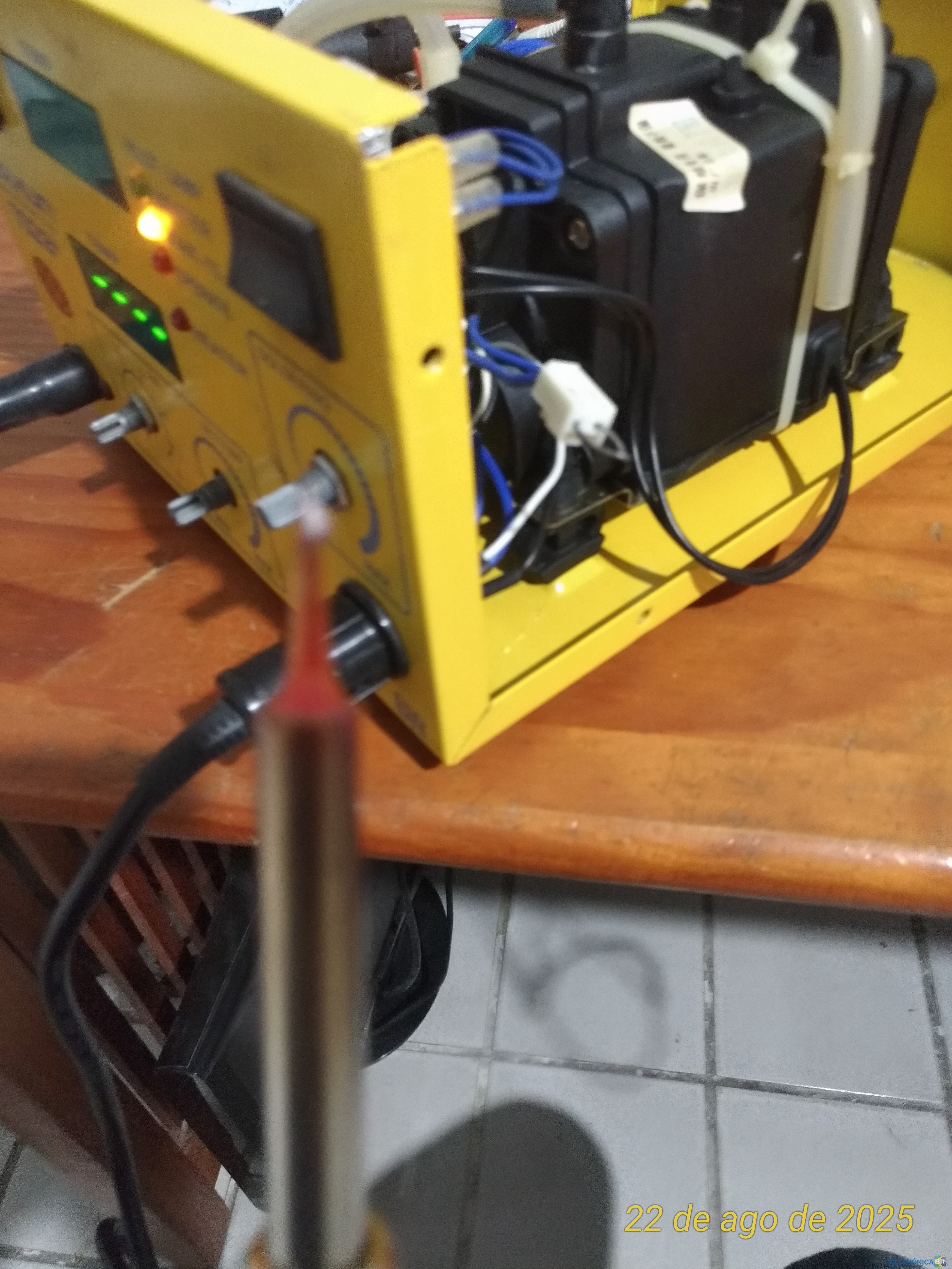 Boas. A quem puder me ajudar. Fico agradecido desde já. Tenho uma estação de trabalho do modelo acima citado. O ferro de solda quebrou e comprei um novo. Ao colocar no lugar percebi que o mesmo não esquentava. Fiz alguns testes e o ferro novo está bom, com a resistência e o sensor bons. Eu abri a estação e desconectei o conector do cabo que vem do trafo e testei com o multimetro no conector e vi que a tensão de 24v está presente. Coloquei um jamper no conector e o ferro esquentou. Mas ele esquentou muito ao ponto de ficar vermelho. Sei que ele esquentou muito por que estava ligado direto, mas isso me tirou a dúvida se o ferro estava bom ou não. E se o conector do ferro, na frente da estação, estava com os pinos bons. A placa não tem nada queimado ou com trilha rompida. Quando ligo ela, o botão de regular temperatura funciona, o display mostra a numeração de temperatura mas logo em seguida apaga e fica só quatro traços nos display. A parte de ar quente está funcionando normalmente. Vi que com o ferro plugado não chega a tensão de 24v nele. Mas no BT136 tem 21v no pino 01(um), 2,6v no pino 2(dois), 21v no pino 03(três). Esses 2,6v do pino Dois é o que aparece na tomada do ferro de solda. Quando deveria ser os 24v. E do trafo está saindo 24v (nesse aqui sai 26v). Estou anexando algumas fotos V_20250820_150736_vHDR_On.mp4 -